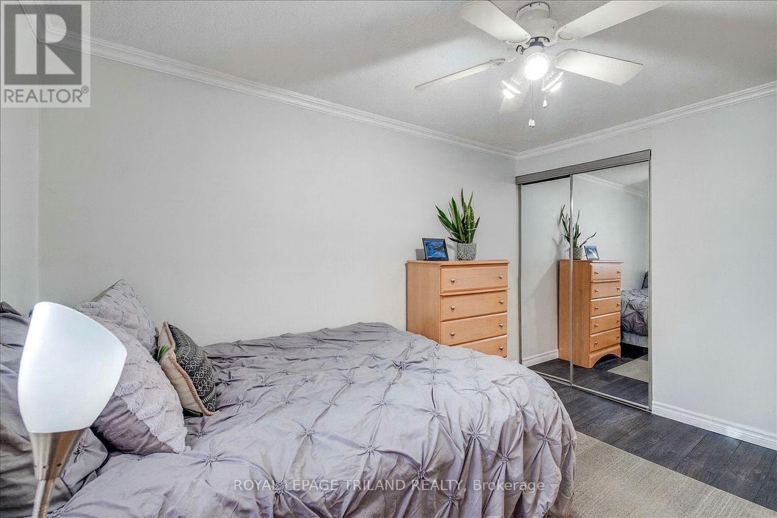$472.25 MonthlyBeautifully maintained end-unit townhome with a carport-style garage. The main floor offers a kitchen, 2-piece bath, and rich laminate flooring through the formal dining area and living room. Bright patio doors provide access to your own fully fenced patio that backs onto open green space. Upstairs features an updated 4-piece bathroom and three spacious bedrooms, including a light-filled primary with a walk-in closet. The finished basement adds valuable living space and extra storage/ personal gym, complete with newly updated flooring (2025). Enjoy the comfort of central heating and air conditioning, no baseboard heaters! Condo fee includes water. Located in a prime location just minutes from Victoria hospital, White Oaks Mall, schools, parks, the Aquatic Centre, and quick access to Highway 401. A wonderful place to call home! (id:59646)